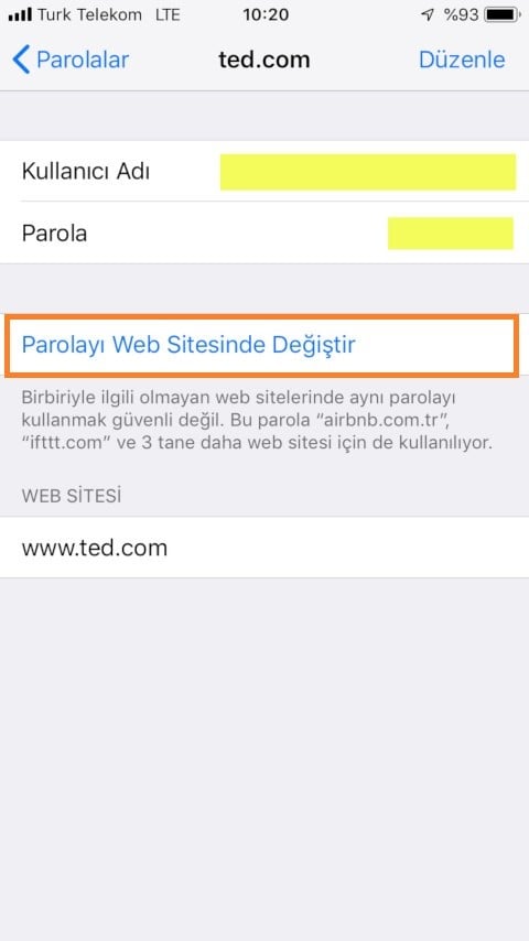 Parolayı Web Sitesinde Değiştir seçeneği ile ilgili web sitesine giriş yaparak mevcut parolanızı değiştirebilirsiniz. Parola değiştirme esnasında iOS size otomatik olarak güçlü bir parola önerecektir, isterseniz kendi parolanızı da bu bölümde oluşturabilirsiniz.